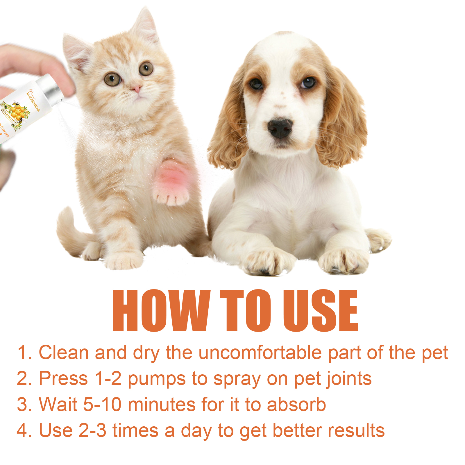 segundosOur pet joint repair spray contains bee venom extract, Arnica flower extract, glucosamine. It can speed up the transport of nutrients, promote the absorption of calcium in pet joints, accelerate the normal healing and repair of connective tissue, and enhance bone health. Its use method is very simple: first clean and dry the uncomfortable parts of the pet, then press 1-2 pump spray on the pet joint, wait 5-10 minutes for it to fully absorb, use 2-3 times a day, the effect is better. After use, it helps to relieve the swelling discomfort of pet joints, improve the flexibility and flexibility of pet activities, and restore the daily activity ability of pets.